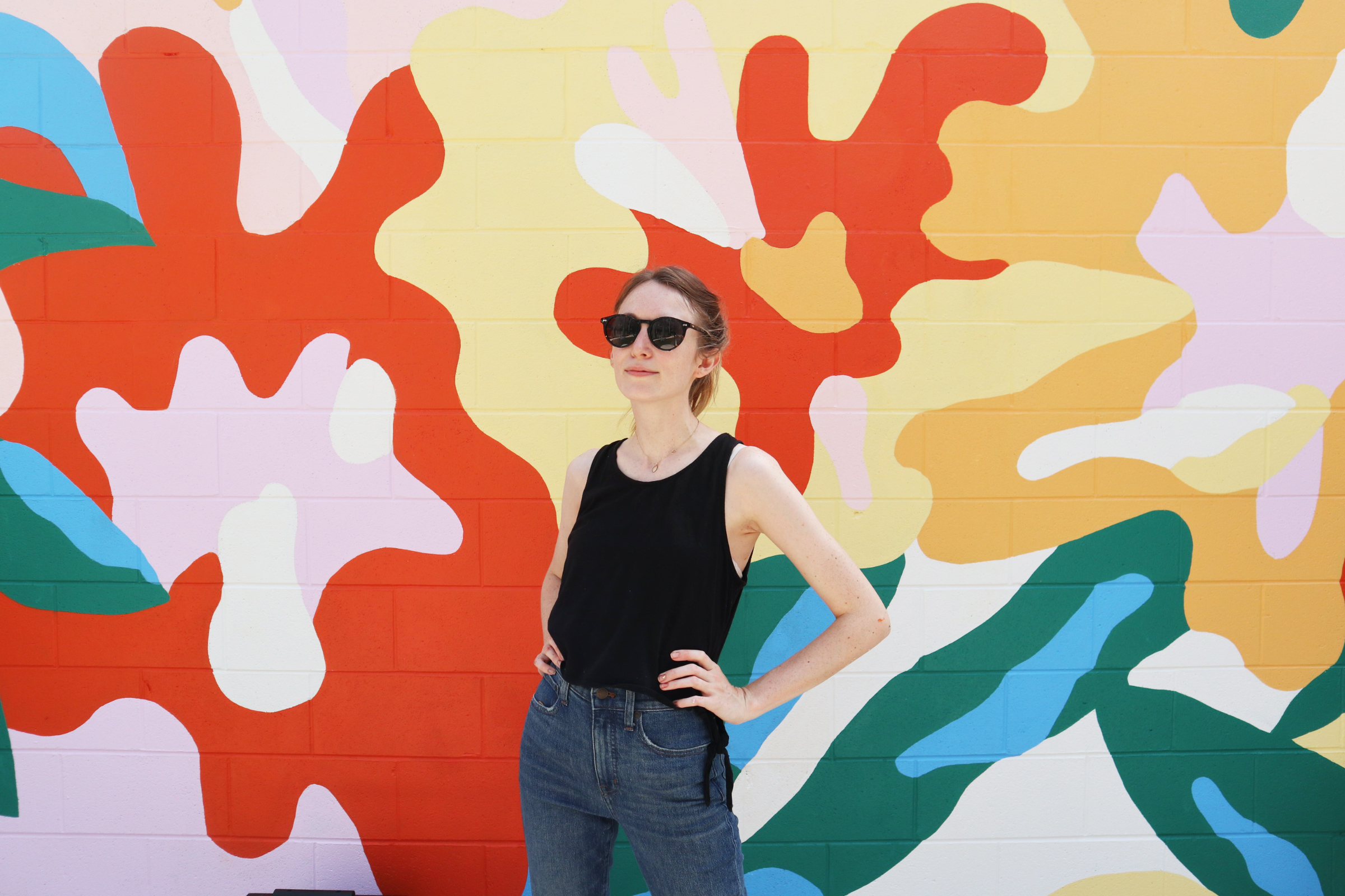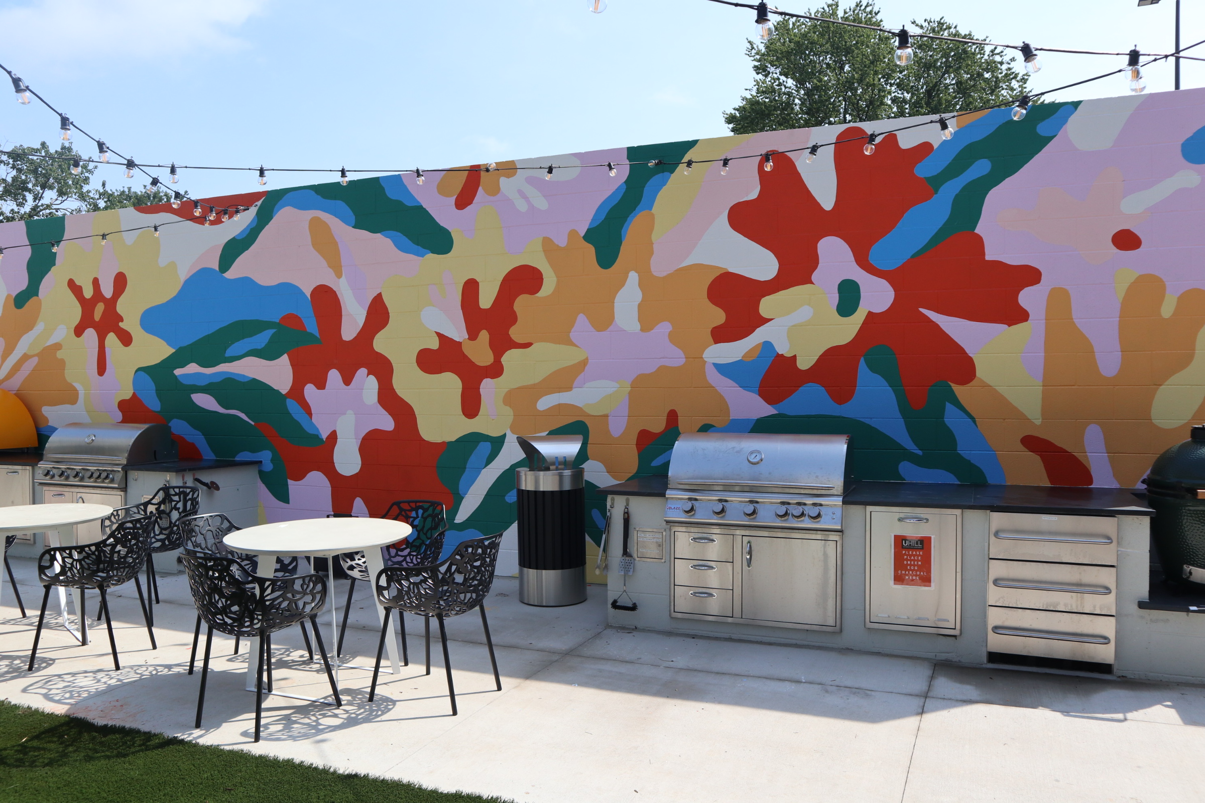 UHill walls invited me down to Durham, North Carolina to paint this mural during their festival. The mural is located in a beautiful courtyard area for a luxury apartment catered to young professionals and college students. I wanted to mural to feel like a patterned backdrop that worked with the space